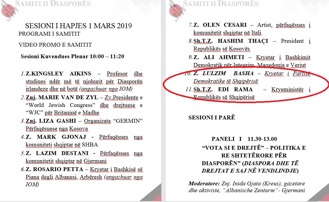 Samiti për Diasporën, ishte aktiviteti për të cilin mund të bashkonte dy rivalët politik, Edi Rama të PS-së dhe Lulzim Basha të PD-së. Qeveria, nëpërmjet ministrit të Diasporës, Pandeli Majko, për këtë event përbashkues mes shqiptarëve, kishte ftuar edhe liderin e PD-së që të mbante edhe një fjalë përshëndetëse, i parafundit në listën e diskutuesve, pas kryeministrit Edi Rama.