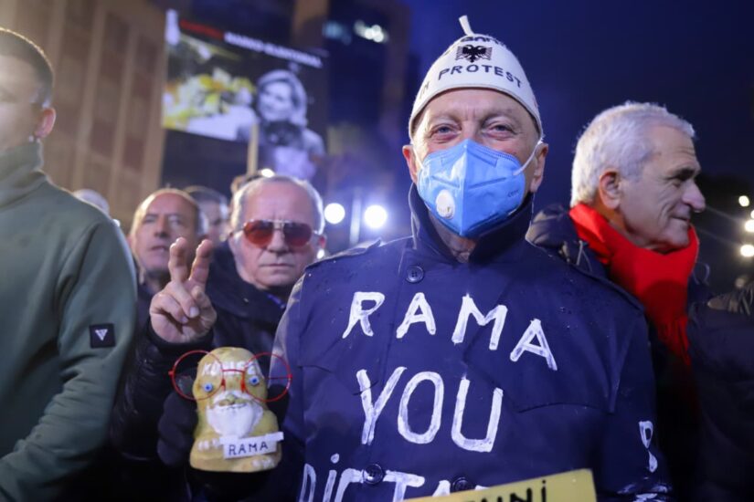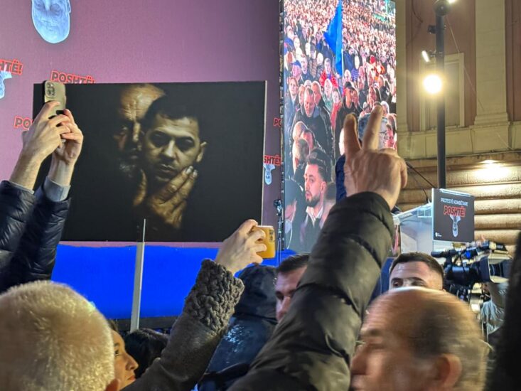 Në një pankartë shihet kryeministri me maskën e Ergys Agasit, ky i fundit i shpallur në kërkim për skandalin e AKSHI-t, pasi akuzohet nga SPAK se ka vepruar me të tjerë si një grup i strukturuar kriminal.