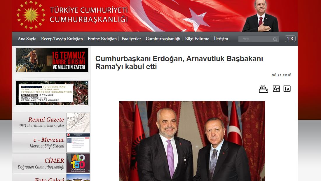Nuk ka një njoftim të vizitës së Ramës në Turqi, ndërsa kjo është bërë e ditur nga faqja zyrtare e Presidentit turk, ku janë publikuar pamjet e takimit.