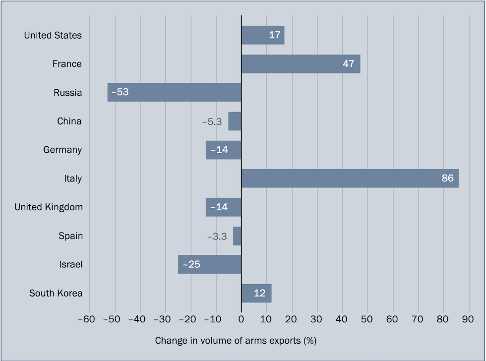 Më e rëndësishmja është se Franca bëhet vendi i dytë eksportues, duke kapërcyer Rusinë, e cila përgjysmoi eksportet e saj të armëve, mbi të gjitha për shkak të luftës në Ukrainë (dhe për rrjedhojë, për shkak të konsumit më të madh të brendshëm: fillimisht me riarmatimin në përgatitje për pushtimin dhe më pas me nevoja për të mbështetur përpjekjet e luftës në vend).