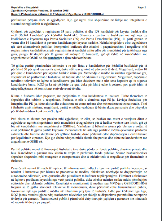 “Protesta të vazhdueshme të opozitës, të drejtuara nga PD-ja, u shënuan nga dhuna dhe vandalizmi kundër institucioneve shtetërore, duke përfshirë më vonë edhe administratën zgjedhore. Kryeministri i hodhi poshtë kërkesat e opozitës dhe, duke paralajmëruar se kjo mund të çonte në krijimin e një precedenti që do të kërcënonte atë çka ai e përshkroi si “bashkëjetesë demokratike” të qeverive të zgjedhura dhe të opozitave të tyre parlamentare, bëri thirrje që zgjedhjet të mbaheshin siç ishin planifikuar.. Kombinimi i thirrjeve të opozitës drejtuar elektoratit për të bojkotuar zgjedhjet, anshmërisë politike të autoriteteve bashkiake dhe përbërjes së paekuilibruar të administratës zgjedhore ndikuan negativisht në besimin e publikut te procesi zgjedhor”, thuhej në këtë raport paraprak. Më tepër ODIHR dukej sikur merrej më shumë me opozitën se sa me mazhorancën, qeverinë e cila ka detyrimin të garantojë procesin zgjedhor.