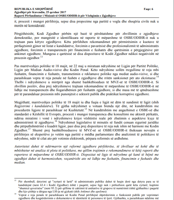 “Ndonëse marrëveshja kontribuoi në një proces zgjedhor më përfshirës dhe një fushatë më pak të polarizuar, zbatimi i saj shpesh vuri në rrezik parimet themelore të shtetit të së drejtës. Miratimi i vonshëm i ndryshimeve ligjore dhe mungesa e konsultimeve domethënëse publike cenuan sigurinë juridike dhe ndikuan negativisht në administrimin e disa komponentëve zgjedhorë, në kundërshtim me angazhimet e OSBE-së dhe standardet e Këshillit të Evropës. Zgjedhjet u vlerësuan për pajtueshmërinë e tyre me angazhimet e OSBE-së dhe standardet e tjera ndërkombëtarë për zgjedhje demokratike, si dhe legjislacionin vendas”.