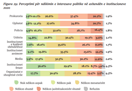 Krahasuar me vitin 2019, një përqindje më e vogël të anketuarish konsideronin gjykatat, median, dhe organizatat e shoqërisë civile si të ndikuara nga interesat politike; ndërkohë që një përqindje më e madhe e shqiptarëve mendonin se sistemi shëndetësor ndikohet nga interesat politike.