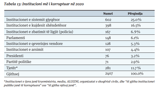 Të pyetur se cili ishte institucioni më i korruptuar në vitin 2020, 602 nga 2407 qytetarë treguan sistemet e drejtësisë, 398 thanë institucionet e sistemit shëndetësor dhe 167 insituticionet e zbatimit të ligjit.