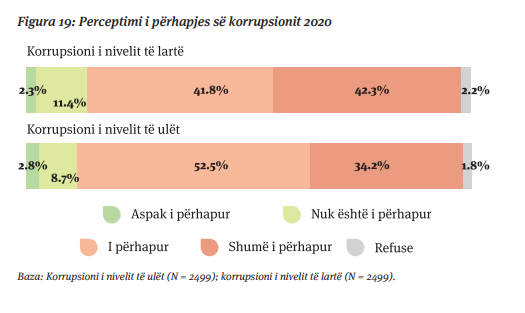 Perceptimi se korrupsioni i lartë është shumë i përhapur në Shqipëri në vitin 2020, u ul me 1% krahasuar me vitin 2019, megjithatë mbeti në nivele të larta.