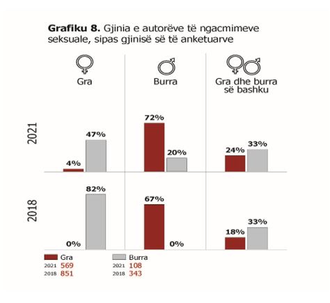 Diçka tjetër e rëndësishme e identifikuar në këtë raport është ngacmimi seksual në punë, ku të dhënat kanë treguar se 23% e të anketuarve janë përballur me të paktën një formë ngacmimi seksual në punë, por nuk ka dallime domethënëse ndërmjet gjinive. Nga të dhënat rezulton se shumica e autorëve të ngacmimeve ishin burrat dhe në 24% e anketave autoret e ngacmimeve ishin gra.