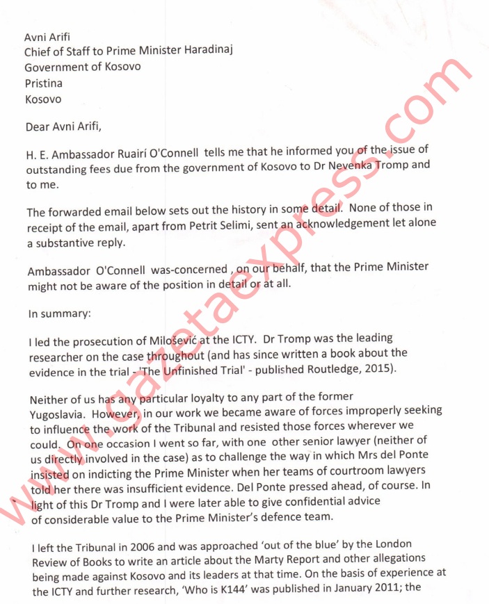 Nice vazhdon të rrëfejë në letrën e tij se pasi ishte paguar për një kohë, papritmas i janë ndalur pagesat nga Qeveria e Kosovës, duke i mbetur borxh gjysmë milionë euro, të cilat tani ende po i kërkon. Pas kësaj ai kërcënonte se nëse këto pagesa nuk do të kryheshin sipas marrëveshjes, ai do të fliste publikisht në media. Nga ky komunikim nuk dihet se sa i ka kushtuar Qeverisë së Kosovës kontrata e Thaçit me dy juristët, megjithatë në të dhënat që i dërgon Nice Qeverisë, prej nëntorit të vitit 2015 deri në fund të korrikut të vitit 2016, duhej t’i paguheshin avokatit Nice 327,445.86 euro, ndërsa avokates Nevonka Tromp 162.975.01 euro (Nevonka Tromp ishte hetuese në rastin e Millosheviçit).