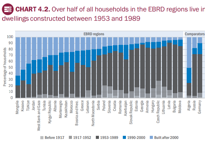 Sipas grafikut, Shqipëria është një ndër vendet e Europës Jug-Lindore me më shumë banesa të reja, rreth 35% e familjeve jetojnë në ndërtesa që janë ndërtuar pas vitit 2000. Gjithsesi mbetet e lartë edhe numri i atyre që jetojnë në ndërtesa më të vjetra. Rreth 40% e familjeve shqiptare jetojnë në banesa të ndërtuara gjatë periudhës komuniste 1953-1989.