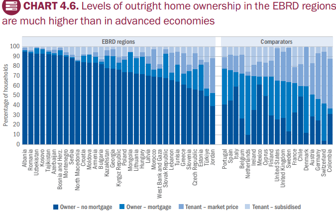 Nga ana tjetër, vendi jonë renditet i pari në listën e BERZH për pronësinë, që do të thotë mbi 90% e familjeve janë pronarë të banesës ku jetojnë. Shqipëria lë pas edhe vendet shumë të pasura me këtë shifër. Kjo sepse sipas BERZH, Shqipëria bën pjesën në grupin e “sistemit dualist” ku banesa/prona vlerësohet si pasuri dhe ka prioritet posedimin e një shtëpie.
