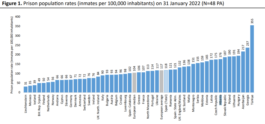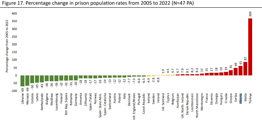 Shqipëria është e treta mes 47-të vendeve të Europës, e cila ka shënuar rritjen më të lartë të numrit të të burgosurve nga viti 2005 deri në vitin 2022, me 61%. Ndërkohë numri i të burgosurve në pjesën më të madhe të vendeve të Europës, përgjatë kësaj periudhe, paraqitet me rënie.