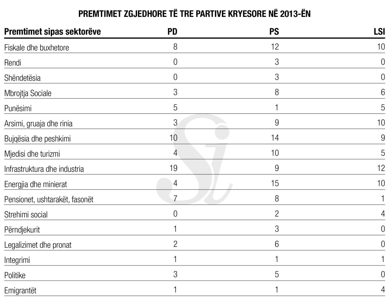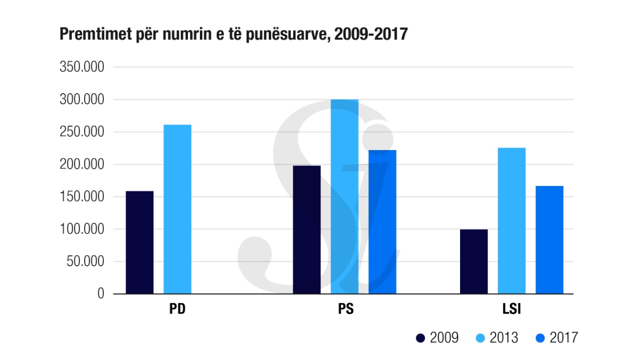 Të ndara sipas tre partive politike kryesore, raporti vëren se rënia më e madhe e premtimeve është nga Partia Socialiste me 60 për qind, ndjekur nga LSI me 52 për qind, ndërsa Partia Demokratike nga 2009 deri në 2017 ka një pakësim premtimesh me vetëm 3 për qind.