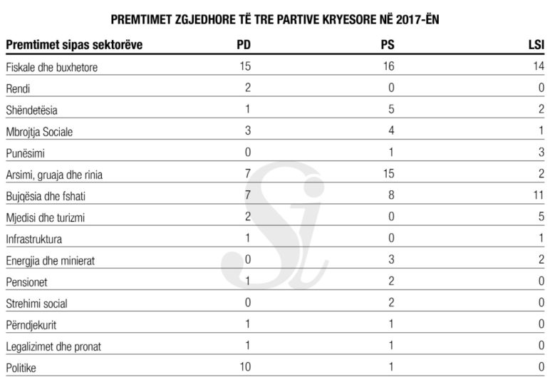 Të ndara sipas partive, analiza vë re se në 2017, LSI premtonte më shumë uljen e taksave, premtime që zinin 36 për qind të premtimeve totale të kësaj force politike, ndjekur nga PD me 9 për qind, ndërsa PS ka premtuar më pak ulje taksash në 2017, ndonëse në 2013 dhe 2009 ka qenë në të njëjtin nivel me PD e LSI për këtë pjesë.