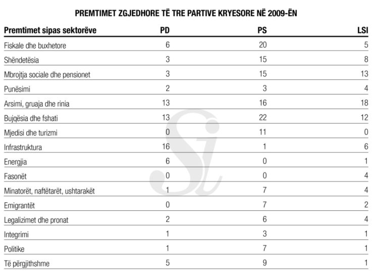 Sipas fushës së premtimeve, nga analiza e Altax, në 2009 partitë politike politike kanë bërë më shumë premtime për bujqësinë dhe fshatin, për arsimin, rininë dhe gruan dhe më pas për taksat, buxhetin, mbrojtjen sociale dhe pensionet. Shëndetësia dhe infrastruktura renditeshin të tretat.