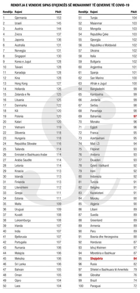 Shqipëria, sipas efiçencës së karantinës renditet në vendin e 69 që do të thotë se edhe karantina nuk arriti të kishte sukses të plotë ndaj Covdi-19. Po ashtu edhe për nga efiçenca e menaxhimit të situatës nga qeveria sipas renditjes, kemi dështuar duke u renditur në vendin e 95 nga 100 vende të shqyrtuara. Edhe përgatitja e urgjencës na ka lënë zbuluar duke u renditur për këtë kategori në vend të 85, kurse sipas rezistencës rajonale renditemi në vendin 75. Për gadishmërinë e kujdesit shëndetësor renditemi në vendin e 57-të. Në total, sipas analizës së 6 kategorive, 30 indikatorëve dhe 130 parametrave Shqipëria është renditur për menaxhimin e situatës Covid-19 në vendin e 88-të.