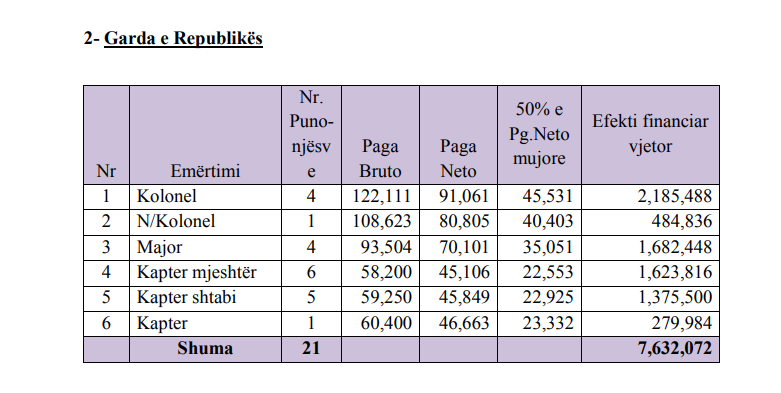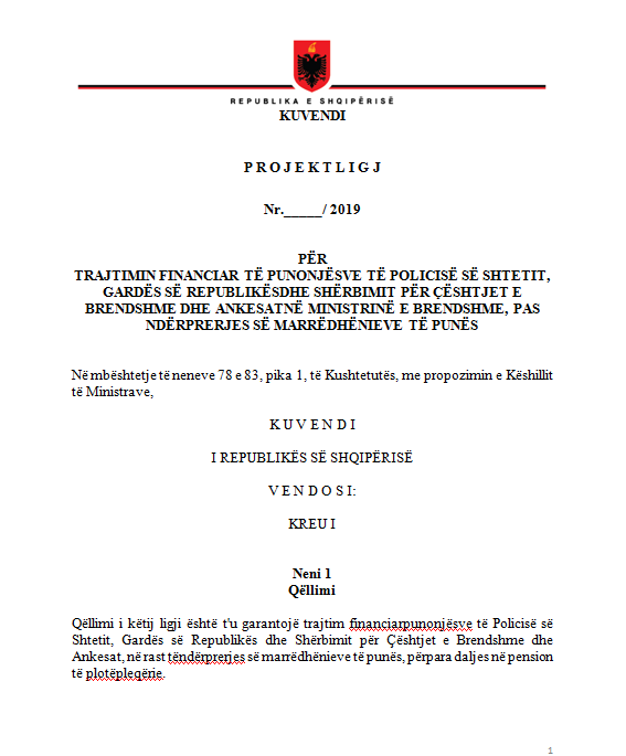 “Trajtimi financiar i punonjësve të Policisë së Shtetit, Gardës së Republikës dhe Shërbimit për Çështjet e Brendshme dhe Ankesat, në Ministrinë e Brendshme, të këtij neni, është në masën 50% të pagës mujore neto, në momentin e ndërprerjes së marrëdhënieve të punës me shërbimin përkatës”, thuhet në këtë draft që pritet të kalojë së shpejti në Parlament.
