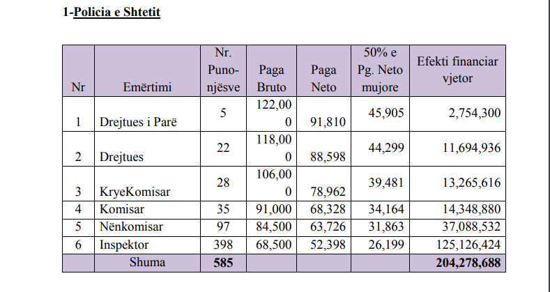 Sipas relacionit të paraqitur nga ministri i Brendshëm, Sandër Lleshaj nga përllogaritjet rezulton se efektet financiare vjetore, nëse zbatohet ligji duke filluar nga viti 2020, për të gjithë punonjësit që plotësojnë kriteret, është 215,506,116 lekë.