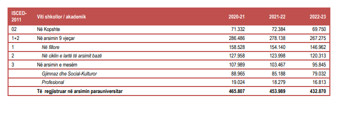 Në arsimin parauniversitar janë regjistruar 5% më pak, në atë parashkollor dhe 9-vjeçar 4% më pak, krahasuar me vitin shkollor 2021-22.