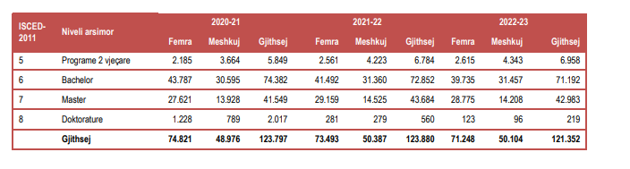 Në vitin akademik 2022-23, numri i studentëve që vazhdojnë studimet në të gjithë programet e arsimit të lartë rezulton 2% më pak se një vit më parë dhe arriti 121.352.
