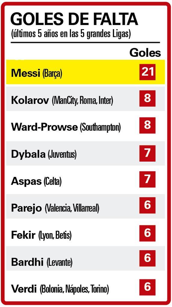 Mediat iberike publikuan 10 futbollistët që kanë shënuar më shumë gola nga goditjet e lira, duke llogaritur si hark kohor 5 vitet e fundit. Në shqyrtim janë marrë vetëm 5 ligat kryesore evropiane, ato që konsiderohen elitë. I vetmi që ka shënuar më shumë se 10 gola nga goditjet e dënimit në 5 vitet e fundit është Leo Messi, i cili ka transformuar 21 të tilla.