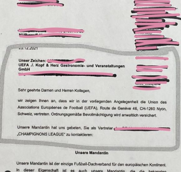 UEFA, sipas burimeve pranë organit qendror të futbollit europian, “është informuar për regjistrimin e një marke me emrin ‘Champignons League’ në Gjermani nga nja aktivitet i rëndësishëm komercial, për shkak të të drejtës së markës, për të cilën UEFA është pronare. Siç ndodh në të tilla raste, përfaqësuesit tanë ligjorë i kanë shkruar këtij aktiviteti tregtar, duke e ftuar të tërheqë kërkesën e regjistrimit për të evituar proceset e tjera në zyrën gjermane të markave”.