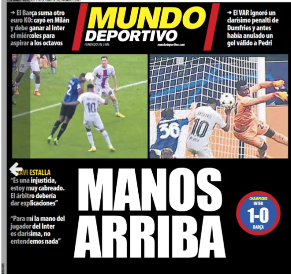 Të dyja skuadrave iu anulua nga një gol, Barcelonës për prekje topi me dorë dhe Interit për pozicion jashtë loje. Por ishte një episod tjetër, që tërboi katalanasit, pasi nuk u mor në konsideratë nga VAR-i. Një prekje e topit me dorë nga Dumfris, që do të thotë një penallti e mohuar.
