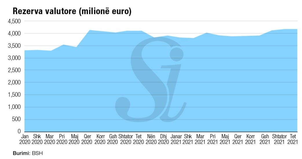 Sipas të dhënave të Bankës së Shqipërisë, rezerva valutore arriti vlerën e 4.2 miliardë eurove duke u rritur me 2% në krahasim me të njëjtën periudhë të vitit të kaluar.