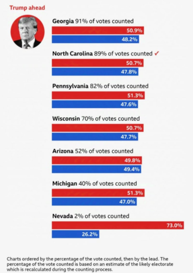 Teksa numërimi vijon, ish-presidenti amerikan, Donald Trump po kryeson zgjedhjet presidenciale të SHBA-së. Deri në orët e para të mëngjesit, sipas CNN, Trump udheheq me 277 vota elektorale ndaj 226 votave elektorale të Harris.