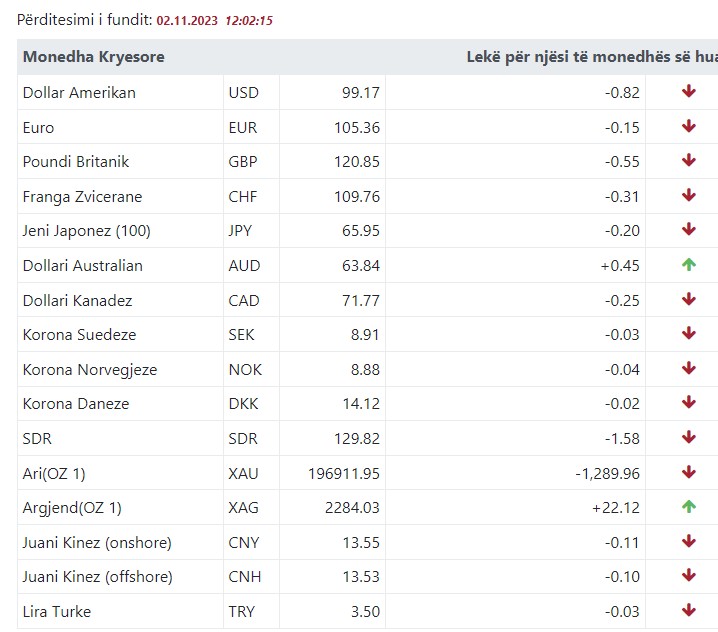 Të njëjtën tendencë kanë pasur edhe valutat e tjera, me dollarin që këmbehet me 99.17 lekë dhe paundi britanik me 120.85 lekë.