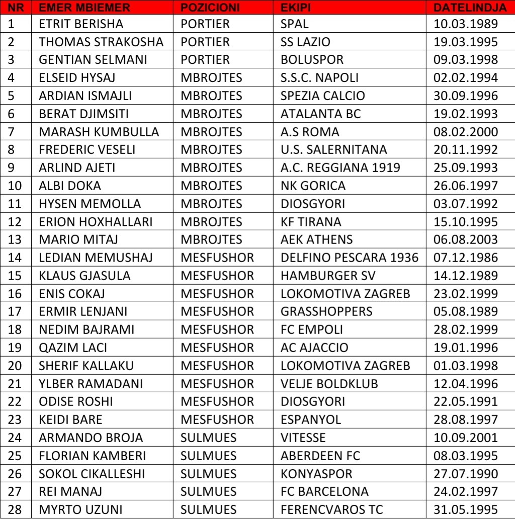 Reja rikthen në Kombëtare, mbrojtësin Arlind Ajeti, pas një mungese të gjatë. Gjithashtu nuk mungojnë as risitë, ku për herë të parë grumbullohen, Nedim Bajrami dhe Mario Mitaj. Për ndeshjet e këtij muaji është grumbulluar edhe Florian Kamberi, i cili ende nuk ka bërë debutimin me Shqipërinë. Ndërkohë mungojnë Armando Sadiku, Bekim Balaj dhe Armir Abrashi.