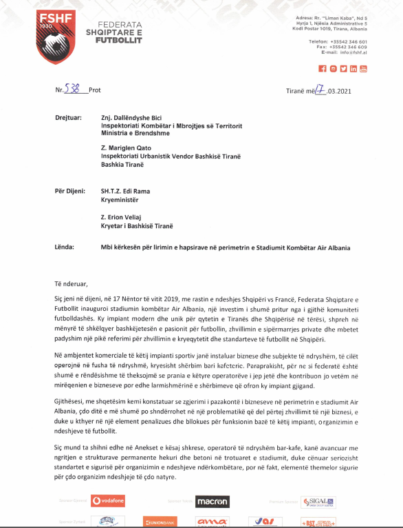 Gjithashtu, siç e dini, Tirana ka marrë besimin e UEFA-s për të zhvilluar finalen e parë të kompeticionit të Ligës së Konferencës, ngjarje historikë dhe e papërsëritshme, që mund të cenohet zhvillimi i saj. Kërkojmë të merrni masa për lirimin e hapësirave“, shkruhet në letrën e FSHF-së