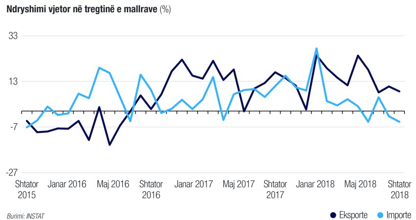 Në nëntëmujorin e vitit 2018 eksportet e mallrave arritën vlerën 231 mld lekë, duke u rritur me 15,3 %, krahasuar me një vit më parë dhe importet e mallrave arritën vlerën 467 mld lekë, duke u rritur me 3,0 %, krahasuar me një vit më parë. Deficiti tregtar arriti vlerën 235 mld lekë, duke u ulur me 6,7 %, krahasuar me 2017.