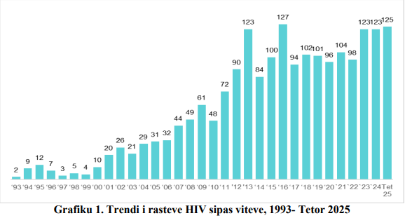 Sipas të dhënave më të fundit nga Instituti i Shëndetit Publik (ISHP), viti 2025 ka shënuar 125 raste të reja deri në muajin tetor, duke sinjalizuar një rikthim në nivelet më të larta të regjistruara që nga viti 2016. Që nga viti 1993, numri total i personave të prekur në vend ka arritur në një total prej 1,973.