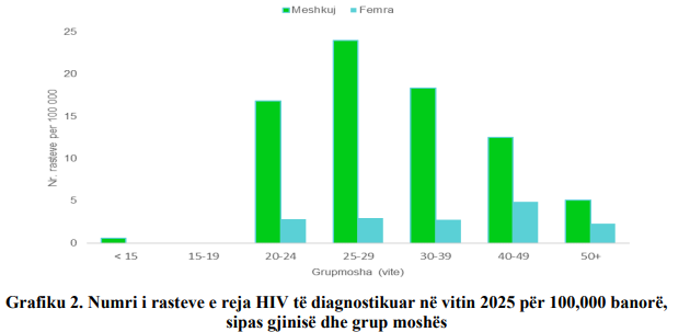 Grupmosha 25-29 vjeç tek meshkujt rezulton më e prekura, me 24 raste për 100,000 banorë. Ndërkohë, tek femrat, incidenca më e lartë regjistrohet në grup-moshën 40-49 vjeç, me rreth 5 raste për 100,000 banorë. Edhe grupi 30-39 vjeç vijon të ketë nivele të larta, veçanërisht tek meshkujt. Pas moshës 40 vjeç, incidenca bie gradualisht, por rastet nuk mungojnë as në moshat mbi 50 vjeç, duke dëshmuar për një përhapje të gjerë në popullatë.