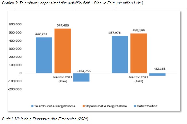 Niveli i deficitit për periudhën 11 mujore të vitit 2021 rezultoi në rreth 32.2 mld, ose rreth 40.7 miliard lekë më pak se e njëjta periudhë e një viti më parë.
