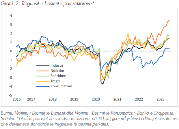 Për bizneset e tregtisë, besimi u rrit me 0.7 pikë përqindje në të njëjtin muaj, ndikuar nga vlerësime shumë optimiste mbi ecurinë e punësimit në të ardhmen të biznesit. Punësimi pritet në rënie.