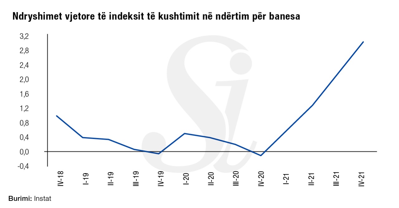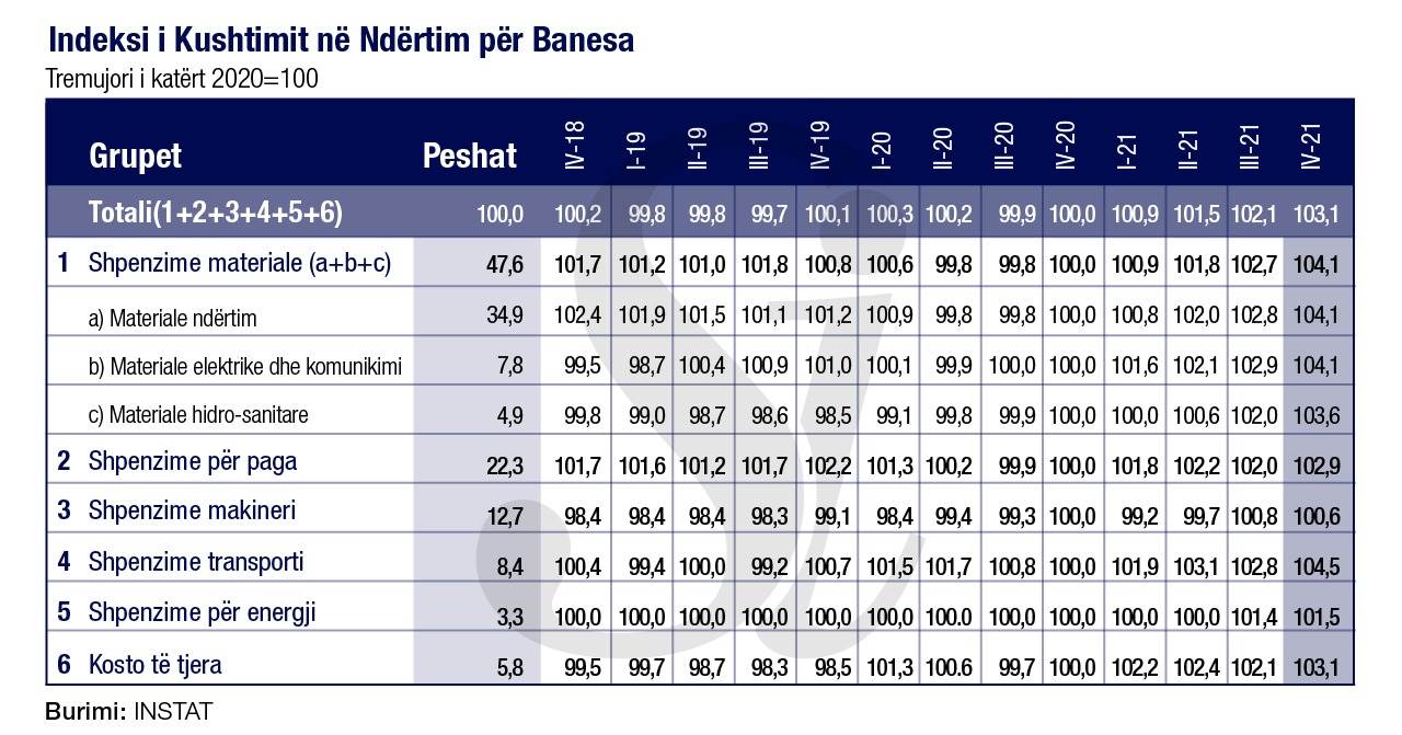 Indeksi i Kushtimit në Ndërtim rezultoi me rritje 3.1% në tremujorin e katërt 2021, në krahasim me të njëjtën periudhë 2020. Shpenzimet materiale zënë gjithashtu një ndikim të madh, prej 4.1%, drejtuar nga materialet e ndërtimit me 4.1% dhe materiale elektrike e komunikimi me 3.6%, nga 2020-a në 2021-shin.
