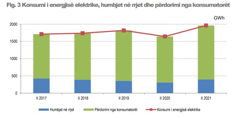 Përdorimi i energjisë elektrike nga konsumatorët, në tremujorin e dytë të vitit 2021, u rrit me 17.2%. Bashkë me rritjen e konsumit të energjisë është rritur dhe humbja në rrjet. Për 3 muajt e dytë të vitit 2021, humbjet raportohen nga Instat në 310.343 MWh, pjesa më e madhe e humbur nga shpërndarja.