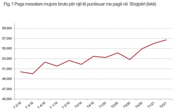 Gjatë tremujorit të dytë të vitit 2021, paga mesatare mujore në Shqipëri u rrit me 4.7%, krahasuar me të njëjtën periudhë të vitit 2020.