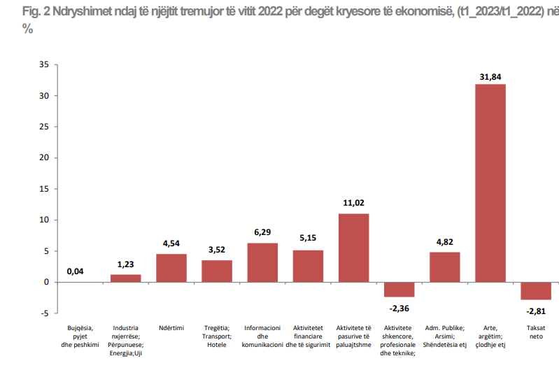 Në rënie raportohet grupi i aktiviteteve profesionale dhe shërbimeve administrative me -2.4% dhe taksat neto me -2.8%.