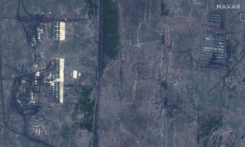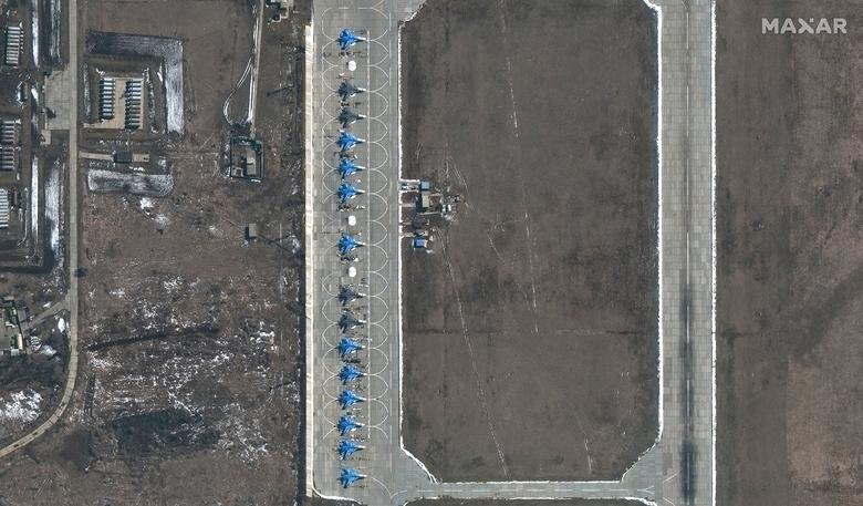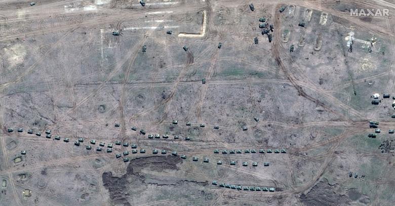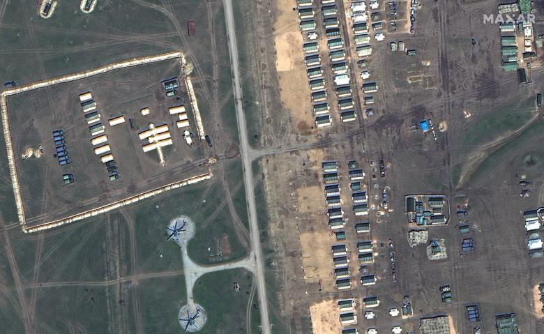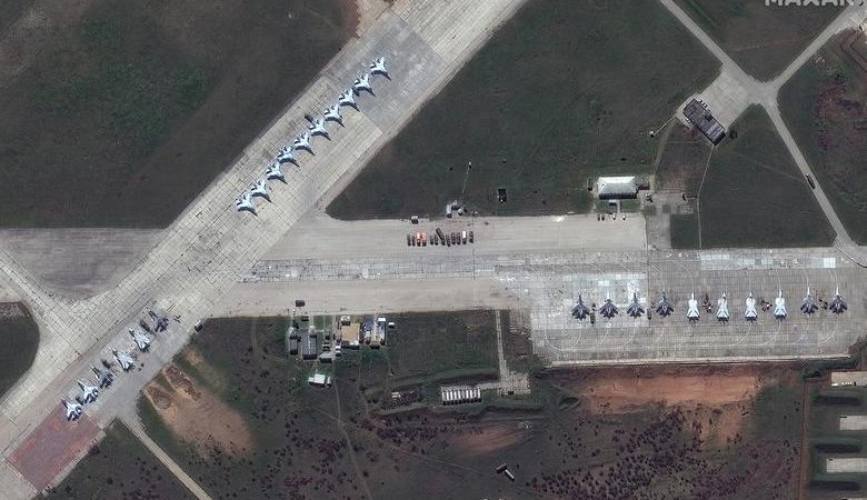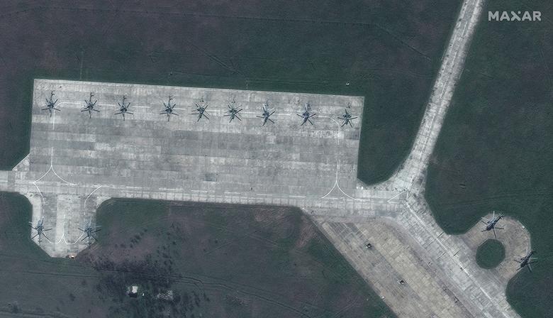 Një pamje satelitore e avionëve ushtarakë, tankeve, artilerisë së rëndë dhe automjeteve të blinduara rusë në Krime më 16 prill. Imazhet satelitore të fotografuara javët e fundit tregojnë rritjen e aktivitetit ushtarak rus në Krime dhe në kufirin Ukrainë-Rusi.\Reuters\