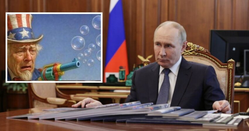 Gazeta Si – Fotoja e gjeneruar nga Inteligjenca Artificiale, tregon një Xhaxha Sam me tiparet e Donald Trumpit, i cili me një armë lodër qëllon flluska sapuni drejt kullave të Kremlinit.