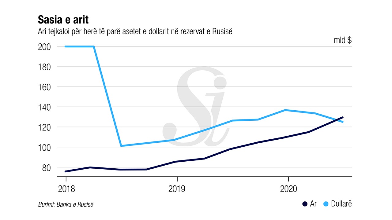 Ndryshimi është pjesë e një strategjie më të gjerë të përshkruar nga Presidenti Vladimir Putin për të “de-dollarizuar” ekonominë ruse dhe për të ulur ndjeshmërinë e saj ndaj sanksioneve të SHBA-ve mes përkeqësimit të marrëdhënieve me Uashingtonin. Ari është tani përbërësi i dytë më i madh i rezervave të bankës qendrore pas euros, i cili përbën rreth një të tretën e aktiveve totale. Rreth 12% e sasisë së parave është në juan.