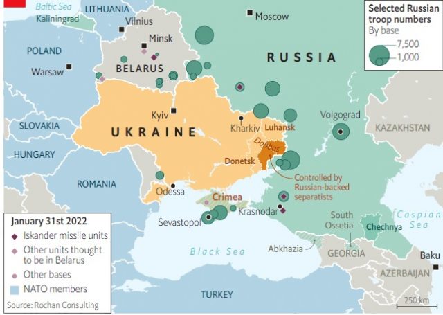 Gjatë luftimeve më të ashpra të luftës Rusi-Ukrainë, në vitin 2015, Rusia dërgoi jo më shumë se një dyzinë btgs. Sot ajo ka 74 deri në 76 btg që janë dislokuar në zonat kufitare, sipas Konrad Muzyka nga Rochan Consulting, i cili gjurmon lëvizjet ushtarake ruse. Rreth 1/5 e tyre janë në Bjellorusi; më 30 janar, një zyrtar amerikan tha se “deri në 30.000” trupa po dërgoheshin atje.