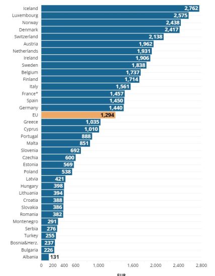 131 euro në muaj përllogarit Eurostat se merr një pensionist në Shqipëri. Mesatarja europiane raportohet rreth 1.300 euro. Në këtë drejtim Shqipëria është larg edhe nga vendet fqinje që i kanë të paktën sa dyfishi i Shqipërisë. Në Luksemburg, pensioni vjetor arrin në 2.000 euro.