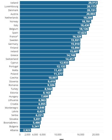 Më anë të metodës PPS, e cila eliminon dallimet e niveleve të çmimeve midis vendeve, maten të ardhurat e pensionistëve në raport me çmimet dhe Shqipërijnë e vlerësojnë me 2.923 PPS, e fundit në kontinent.