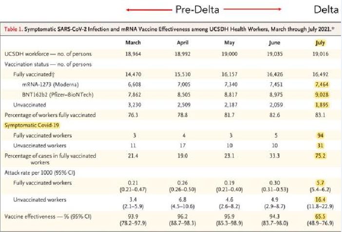 -Në Kaliforni, si në pjesë të tjera të botës, midis qershorit dhe korrikut varianti Delta u bë mbizotërues dhe, në krahasim me variantin Alfa (ose lloji original i virusit), vaksinat duket se kanë më pak efikasitet kundër infeksionit (simptomatik dhe ndryshe).