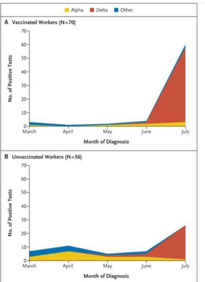 Sidoqoftë, në lidhje me përfundimin e detyrimit për të mbajtur maska në Kaliforni (15 qershor) dhe përhapjen e shpejtë të variantit Delta, i cili në korrik përbënte gjysmën e infeksioneve në mesin e stafit të spitalit, infeksionet janë rritur me shpejtësi edhe në mesin e atyre që kishin përfunduar ciklin plotë të vaksinimit.