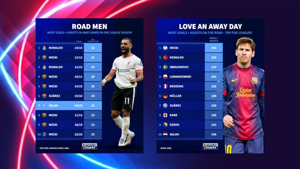 Ndërsa Messi e ndjek me atë çka bëri në sezonin 2012/13 kur kontribuoi për 31 gola në transfertë te Barcelona. Argjentinasi shfaqet 6 herë në 10 vendet e para ndërsa numrat e Salah këtë sezon me Liverpool e vendosin atë në vendin e 7. Ai ka nevojë të shënojë ose shërbejë për 8 gola larg Anfield që të thyejë rekordin e Ronaldo-s. Në këtë periudhë Liverpool do të vizitojë Aston Villa-n, Manchester City-n dhe Chelsea-n. Klasifikimin prej vitit 2000 për gola dhe asist në transfertë e kryeson Lionel Messi, i ndjekur nga Cristiano Ronaldo. Ndërsa mes 10 të parëve gjen emra si Zlatan Ibrahimovic, Robert Lewandowski dhe Karim Benzema.