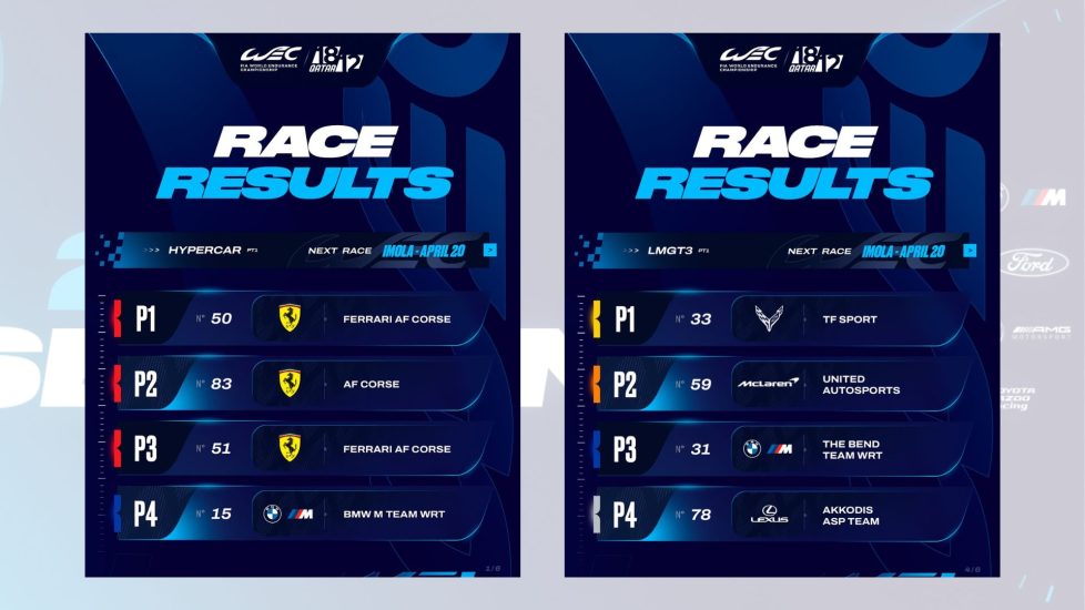 “#50 Ferrari AF Corse” kryesoi dhe u rendit e para e ndjekur nga skuadra private “#83 AF Corse 499P Hypercar” dhe #51 që u nis nga pole position për një triumf historik të markës italiane në disiplinën “Hypercar FIA WEC”. Në “Le Mans GT3”, Daniel Juncadella dhe TF Sport përdorën eksperiencën për të fituar pas 10 orëve duelin me Grégoire Saucy në bordin e McLaren. 12 muaj nga dominimi, “Porsche Penske Motorsport” bëri një paraqitje të dobët në vizitën e dytë në Lusail.