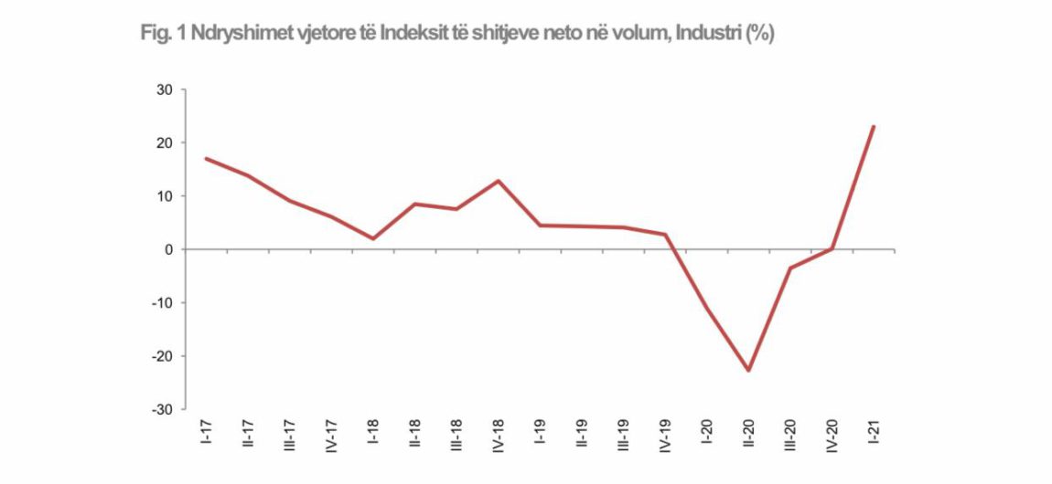 Në të gjithë sektorin e prodhimit, indeksi i shitjeve neto në volum shënoi rritje 23,0 %, krahasuar me të njëjtën periudhë të një viti më parë.
